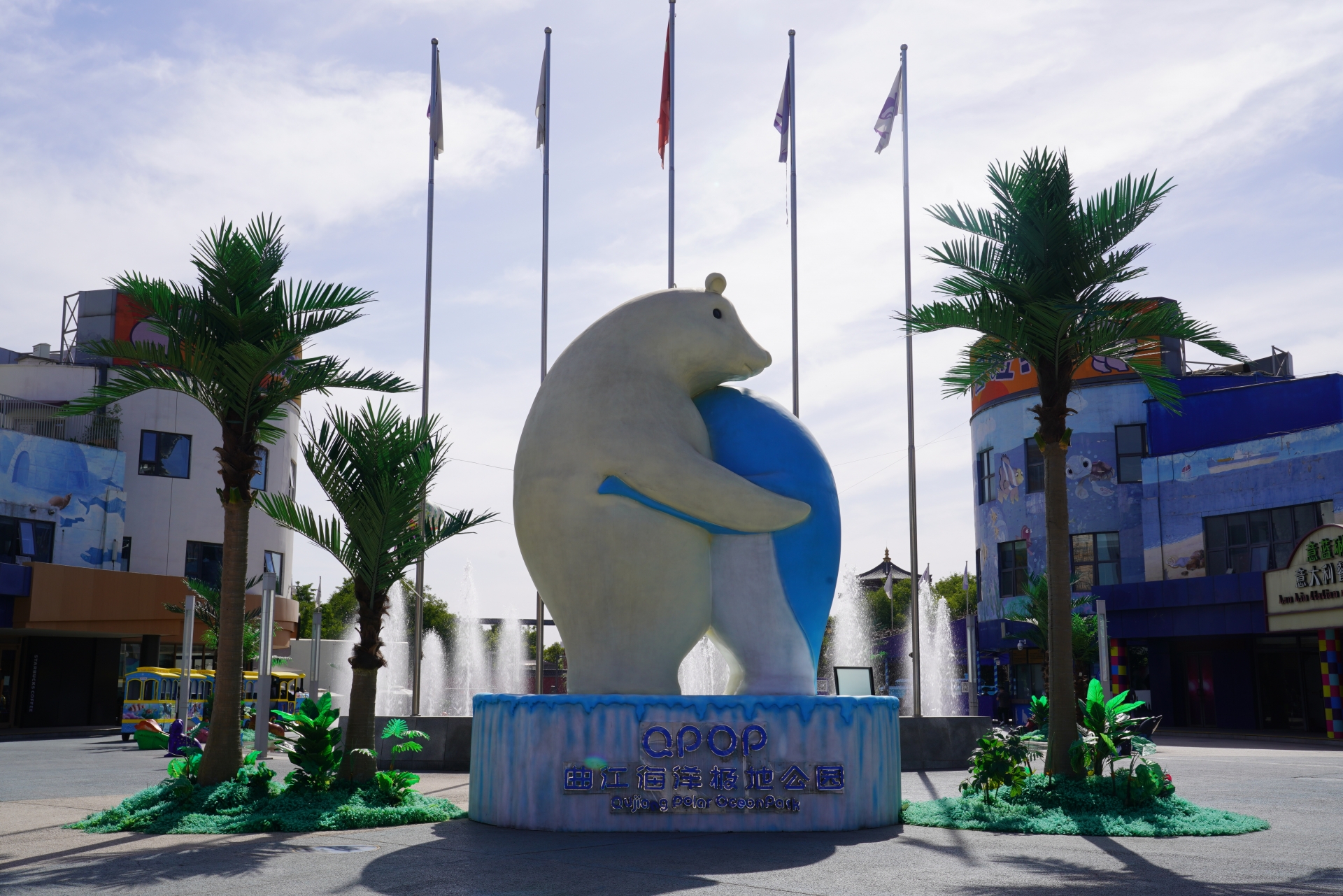 海韵前广场曲曲和江江两位小朋友正带领着小动物们在欢迎大家的到来,在喷泉的周围,还可以看到海豹海狮等海洋动物的雕塑,这里也成为小朋友们合影留念的绝佳场所。在广场中央的是熊抱企鹅雕塑,它是公园的主题雕塑,图形以南北两极最具代表性的熊和企鹅为主体。南极距北极有19950千米,它们跨越地球两端拥抱在一起,代表曲江海洋极地公园将两极文化相结合,是一个展示海洋世界景观和极地旖旎风光的文化主题公园。