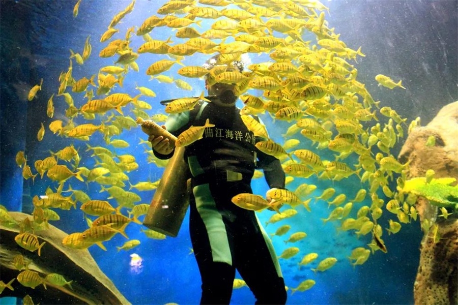 黄金鲹分布于日本琉球群岛以南、印度洋、中西太平洋海域,我国产于南海。因色彩艳丽,体型优美,所以也常被作为水族馆的观赏鱼而广泛饲养,当一群黄金鲹在水中畅游时,那壮观的景象常让人流连忘返。黄金鲹常喜欢追随大型鱼类洄游,也跟随潜水员巡游,因此有领航员之称。每当饲养员带着食物来临,黄金鲹便追寻而来,卷起一股海底的黄金风暴,上演一场人鱼共舞的绚丽演出,让游客们感受来袭大海的神奇魅力。